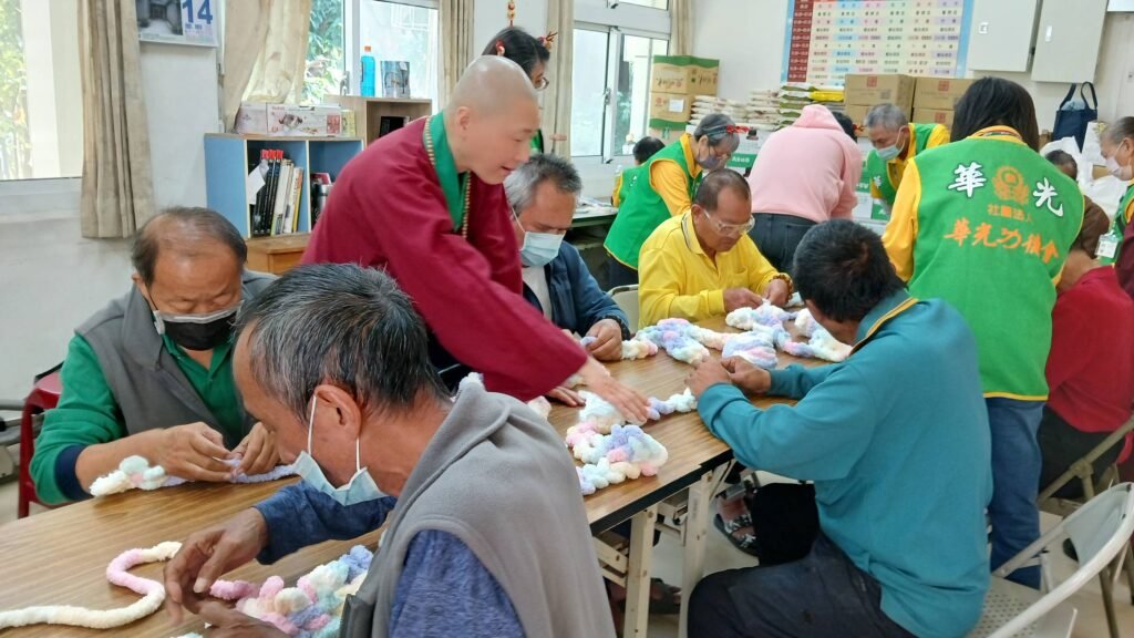 乙巳歲末年終之際,華光功德會的心靈關懷團隊再度來到鳳山慈心園街友中心,為園中的夥伴們帶來一場手作課程與佛法啟迪的心靈饗宴。這是一場充滿溫情與法喜的活動,不僅是對過去「乙巳蛇年」的感恩回顧,更是對即將到來的「丙午馬年」的集體祈願。活動結合了藝術創作、歲末祝福、聖誕寓意解析、全球災難省思、以及佛號的誦念,歡喜天使與夥伴們在善念中凝聚力量,共同迎接充滿希望新的一年。