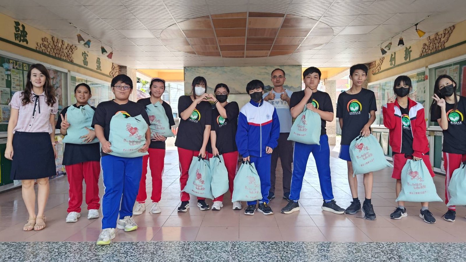 在學校裡,志工團隊與元富國中的師長及受贈學生們相見歡。看著這群正值青春年華的孩子,手中提著充滿心意的愛心袋,透過鏡頭比出開心&感恩的手勢,這份純粹的喜悅,深深觸動在場的每一位義工。陪伴孩子們安心就學、快樂成長、正是華光功德會持續推動校園關懷的最大動力。