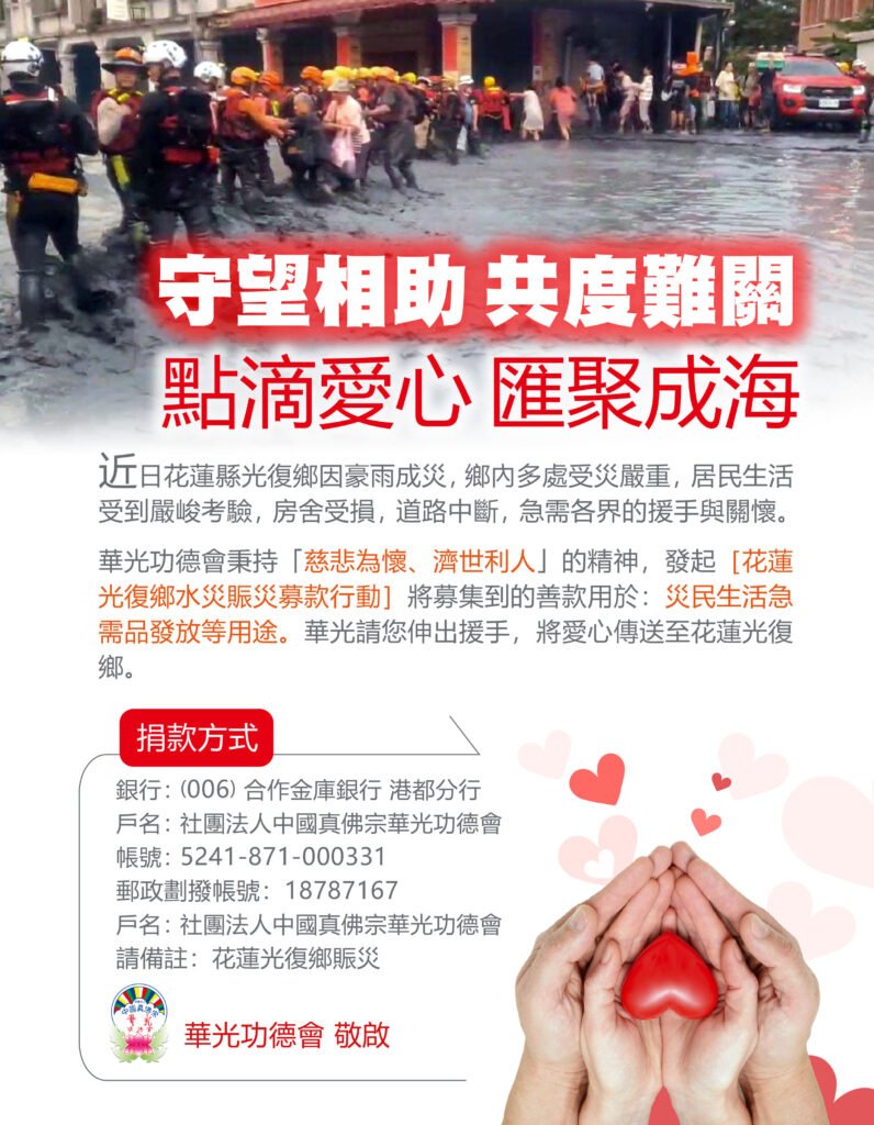 華光功德會秉持「慈悲為懷、濟世利人」的精神,發起「花蓮光復鄉水災賑災募款行動」,將募集到的善款用於:災民生活急需品發放等用途。