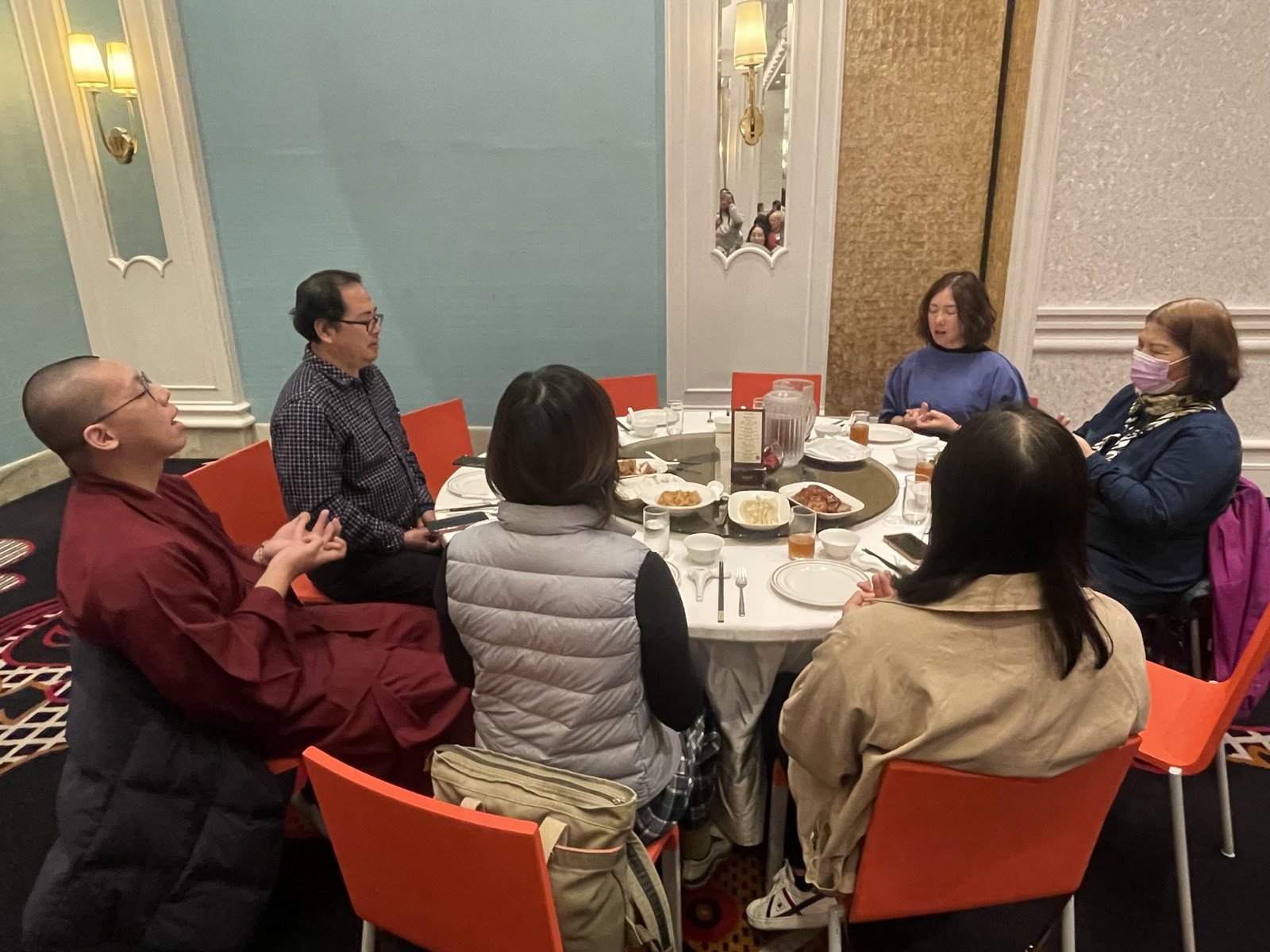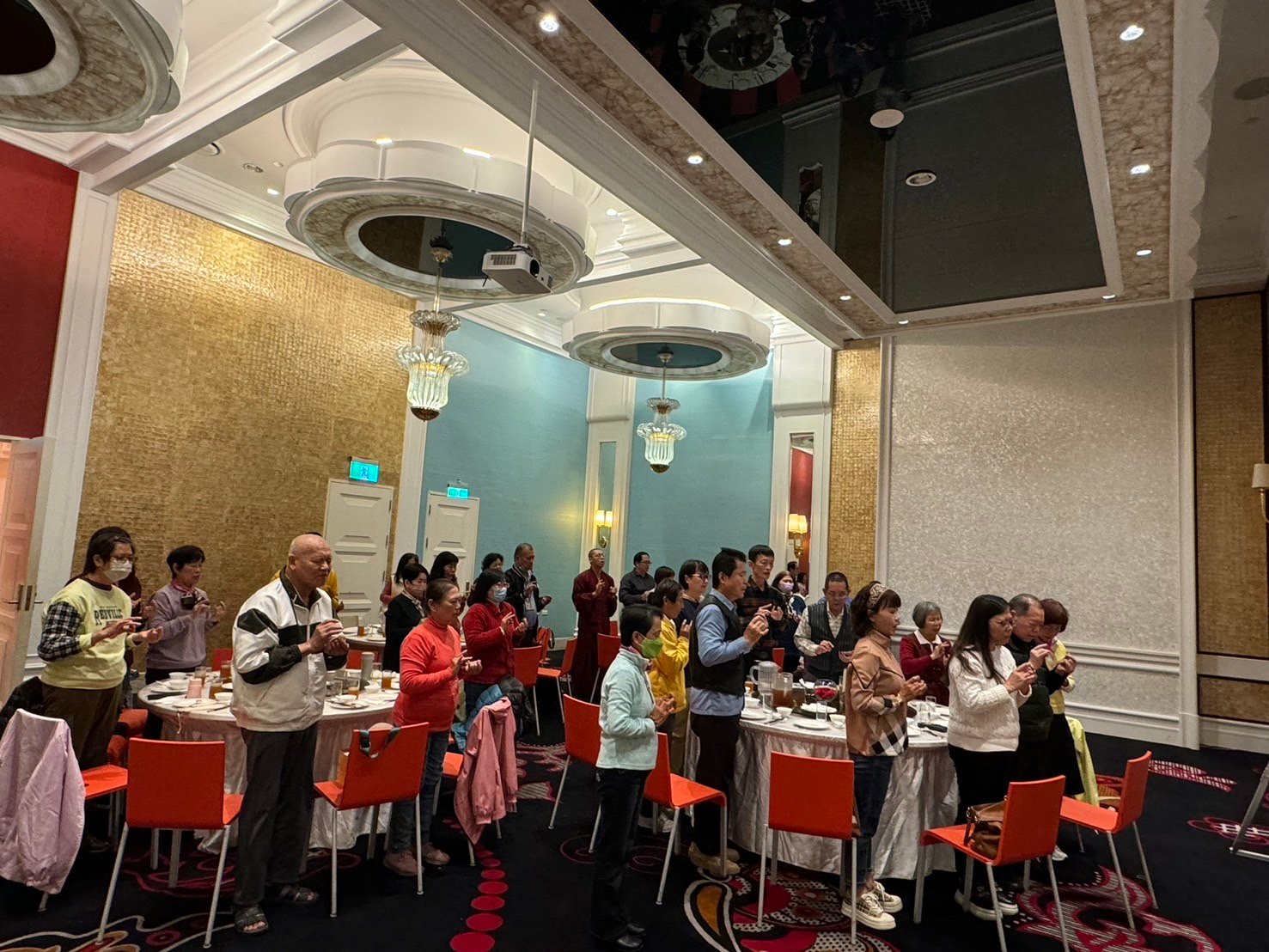 大家到齊之後,蓮岩法師帶領頂禮根本上師及傳承諸佛菩薩,並做餐前廣大供養。