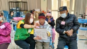 大家圍坐成圈,天使陪在長輩之間,還記得手語「大家」怎麼比呢?就如同現在這樣用手指畫一個圈,就是代表「大家」的意思。蓮竹教授師和蓮茗法師首先送上祝福後,接著每位天使站在長輩前方,一對一的方式以念佛歌聲獻上祝福,並送上一份小禮物。